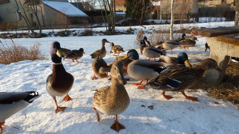 V hlubokých mrazech byly kachničky z lišanského rybníka vděčné za krmení od lidí,foto z 1.3.2017